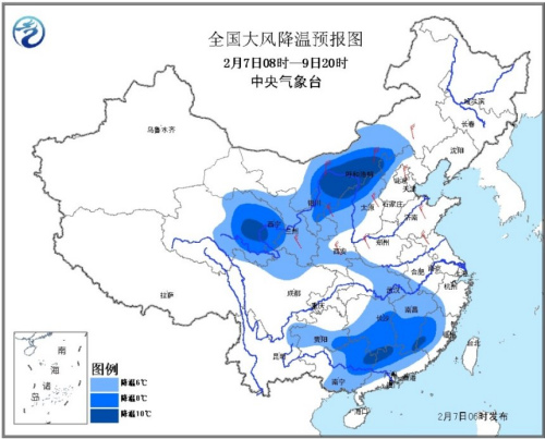 據(jù)中央氣象臺網(wǎng)站消息,2月7日06時(shí)繼續(xù)發(fā)布寒潮藍(lán)色預(yù)警:預(yù)計(jì),受寒潮影響,7日至9日,我國中東部大部地區(qū)自北向南將先后出現(xiàn)大范圍大風(fēng)降溫和雨雪天氣,平均氣溫將普遍下降4℃以上,其中,青海東部、陜西北部、內(nèi)蒙古中部、山西北部、貴州東南部、湖南中南部、江西中南部、福建西部、廣西北部和廣東北部等地氣溫將下降8℃以上,局地超過10℃。長江以北地區(qū)并伴有4~6級偏北風(fēng),東部和南部海區(qū)風(fēng)力有7~9級。