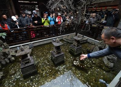 中午時(shí)分,記者又一次仔細(xì)觀察了水池,在游人拋投硬幣時(shí),確實(shí)有一兩條金色的觀賞魚(yú)在石縫處游動(dòng)著。在木制欄桿四周,正貼著“禁止倚靠欄桿”、“禁止投幣”等字樣?!按汗?jié)游客爆滿,水池是從寬巷子到窄巷子的必經(jīng)之道,加上很多人在拋硬幣,頓時(shí)人滿為患。我們只好打印了幾張?zhí)嵝褟堎N起來(lái)?!鞭k公室工作人員還表示,“等春節(jié)游客潮稍微退卻,天氣回暖,我們就要派人下水打撈這些硬幣,用于景點(diǎn)建設(shè)。”
