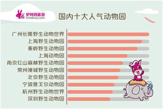 《報告》顯示,在動物主題游項目中,動物園和野生動物園仍然以超過50%的出游人數(shù)占比第一,海洋公園和海洋世界類景區(qū)增長較快,占比33%。而以動物為主題的酒店類產(chǎn)品下單人數(shù)顯著增加,“度假”成為未來動物主題游的趨勢也越發(fā)明顯。 除此之外,驢媽媽根據(jù)去年一年其平臺上的訂單數(shù),統(tǒng)計出了國內(nèi)動物園類景區(qū)人氣榜,廣州長隆野生動物世界依然最受游客追捧,而上海野生動物園、秦嶺野生動物園、上海動物園、南京紅山森林動物園、常州淹城野生動物園、北京野生動物園、寧波雅戈爾動物園、杭州野生動物世界、深圳野生動物園也位列十大人氣動物園榜單之列。
