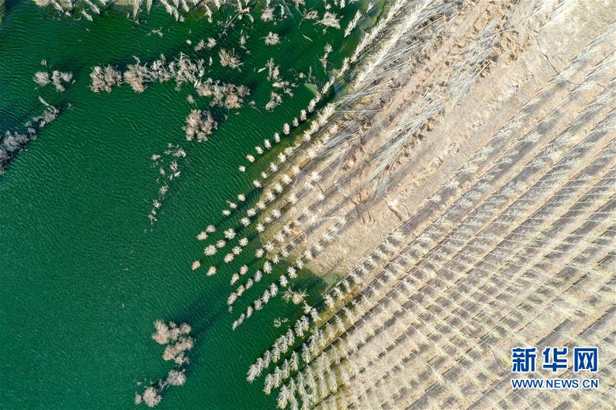 這是4月19日拍攝的阿勒泰市中水庫一角(無人機(jī)照片)。近年來,新疆阿勒泰市利用經(jīng)污水處理廠處理達(dá)標(biāo)后的中水,灌溉建在戈壁灘上的苗圃基地,形成良性循環(huán),助力綠化工程,改善生態(tài)環(huán)境。從2017年至今,阿勒泰市中水回用環(huán)境治理示范園已為當(dāng)?shù)鼐G化工程提供40萬株樹苗,實現(xiàn)5000畝荒山綠化。 新華社記者 丁磊 攝