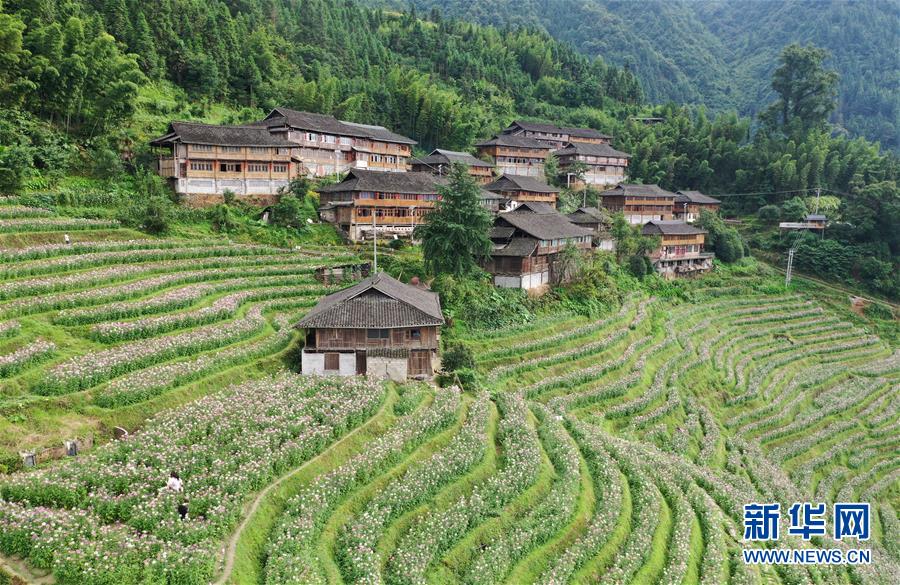 7月6日拍攝的龍勝各族自治縣泗水鄉(xiāng)周家村布尼梯田(無人機照片)。 近日,廣西龍勝各族自治縣泗水鄉(xiāng)周家村布尼梯田種植的近千畝鮮花競相開放,美不勝收。 新華社記者 陸波岸 攝