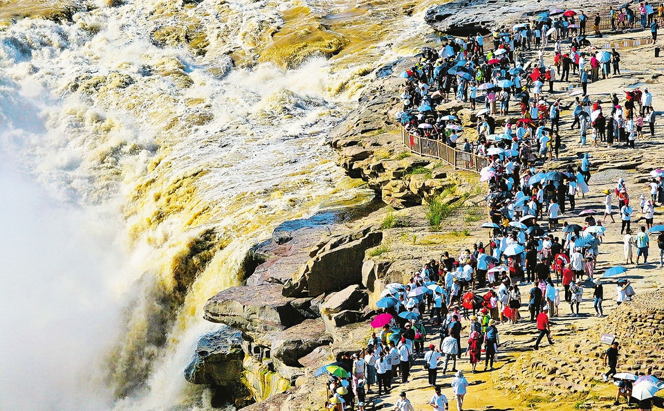 8月20日,游客在吉縣黃河壺口瀑布游覽觀瀑。近期,黃河壺口瀑布水量增大,形成綿延200余米的特大瀑布群景觀,氣勢磅礴,吸引了眾多游客前來感受瀑布和黃河的雄渾之美。