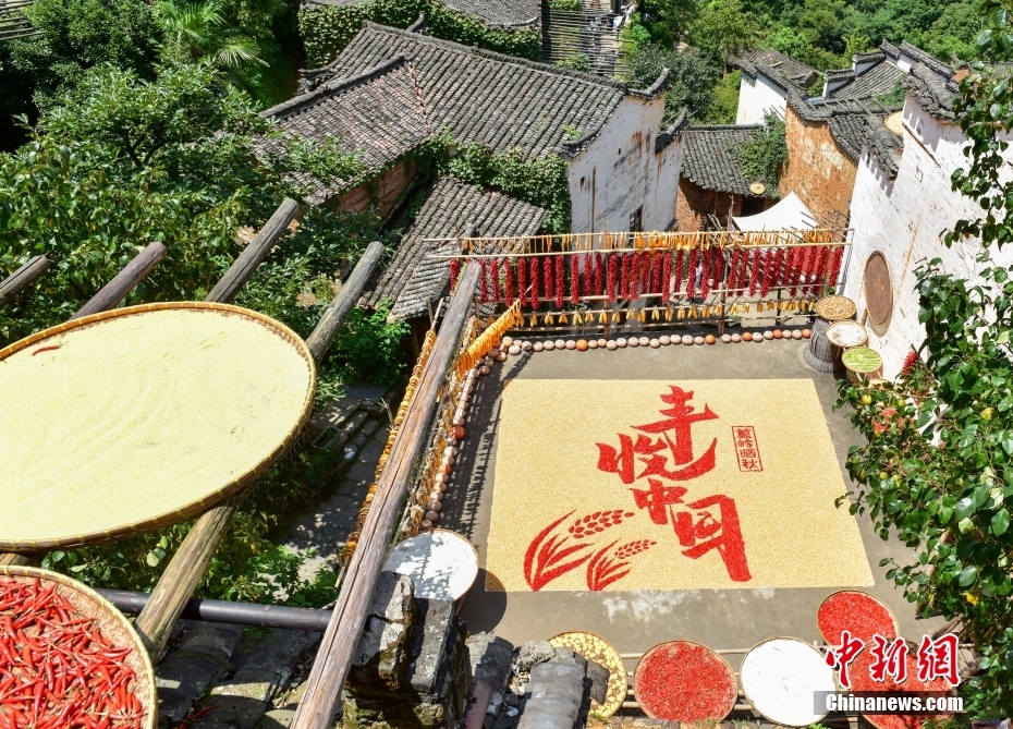 由于婺源的大多村莊是依山而建,平地較少,為將晾曬的食材安排的合理妥當,家家戶戶都展現了自家“空間管理”的高超技巧。圖為江西上饒婺源篁嶺古村,篁嶺獨具古韻的閣樓人家,處處可見絢爛的曬秋。稻谷、玉米、南瓜、豌豆、蘿卜曬在竹匾上,用橫木托著。