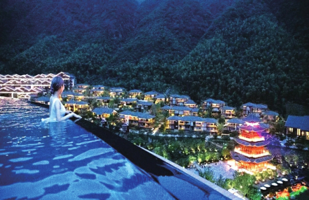 徜徉泳池,可觀落日余暉、滿天星辰,一邊是古風(fēng)古韻的漢唐建筑,一邊是綠意正濃的山林竹間;一半是封存塵世的自然風(fēng)景,一半是觸手可及的浪漫風(fēng)情。俯瞰葛仙村,盡享古韻之美。傍晚,落日余暉均勻曬在水面上,散為金光,而晚霞,也幻成異樣的色彩,一層層的光和色,相互交融著,“落霞與孤鶩齊飛,秋水共長(zhǎng)天一色”的意境就是如此吧。夜里輕柔的晚風(fēng),拂過泳池,水波粼粼,被周邊的燈光映襯得就像無數(shù)的水晶鋪設(shè)在水面上,星空與池底交相呼應(yīng),帶來無盡的浪漫氣息。