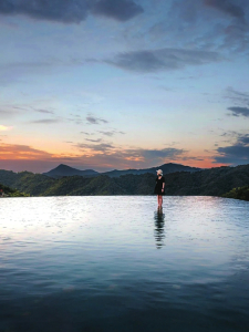 白天,游人可以搭乘索道登上葛仙山,行在山中,可見清泉瑩然,苔蘚盈階、云海翻騰,可聽泉水響動(dòng),天色如夢(mèng)變幻。葛仙山的翠竹、樹木極多,是一道天然的屏障,趕在落日之前,快步來到葛仙村無邊泳池,赴一場(chǎng)“橘色云朵+藍(lán)色池水”的浪漫。