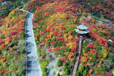 龍山、太山景區(qū)位于風(fēng)光秀麗、重巒疊翠的太原西山,東臨晉陽(yáng)古城遺址,西接天龍山風(fēng)景區(qū),盤繞在崇山峻嶺之中,是太原西山文化帶的璀璨明珠,集豐富的歷史遺存與優(yōu)美的自然景觀為一體。每年深秋,秋葉臨霜而紅,層林盡染,漫山紅遍。聞名遐邇的“西山紅葉”正逢盛季,萬(wàn)畝紅葉流丹似火。龍山、太山紅葉,是太原西山地區(qū)分布面積最大、最為集中的紅葉觀賞地。游客順著山勢(shì)拾級(jí)而上,山巒環(huán)抱的山坳里、溝谷中、山脊上,一團(tuán)團(tuán)一簇簇,或紅或橘,或黃或綠,仿佛置身大自然的畫盤之上。