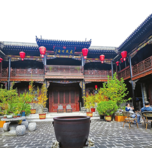 現(xiàn)在的書院是閆氏后人本著致力于保護歷史宅院、續(xù)寫古城書院文化的初心,修繕復原。客棧為兩進院,整體為木構(gòu)建筑,延續(xù)了明清時期建筑大院的特點。大院的一椽一檁,隨處可見福祿壽、梅蘭竹菊、祥云葡萄等美輪美奐的造型,包括樓梯扶手上的猴母子、童子抱鯉、南瓜等石雕也寄托著晉商們對美好生活的愿望。20間客房,零落擺放有閆氏珍藏的清乾隆窯變紅釉冬瓜罐、大漆描金彩繪衣柜等價值數(shù)萬元的裝飾。