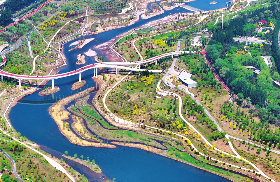 5月19日,俯瞰汾河四期濕地公園,草坪綠意盎然,花海濃烈絢爛,汾河水清涼怡人。從整體到細節(jié),從視覺到聽覺,公園河景與岸景融為一幅色彩斑斕的夏日美景,讓人流連忘返。