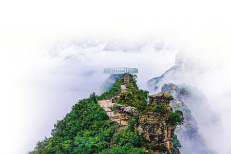 出玻璃棧道后向下走大約2分鐘,會(huì)相繼遇到兩處岔路口,不要轉(zhuǎn)彎,繼續(xù)直行2分鐘即可到達(dá)天露臺(tái),位于仙人峰最高處的它是俯瞰大峽谷的絕佳之處,天露臺(tái)下臨絕壑,凌空憑虛,原來(lái)在谷底看起來(lái)直插云天的峭壁山峰,都匍匐在腳下,頗有一覽眾山小之感。南太行的雄渾大氣在此被展現(xiàn)得淋漓盡致。
