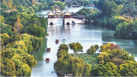 10月28日,游客在江蘇揚州瘦西湖風景區(qū)游玩賞秋。金秋十月,神州大地色彩斑斕,秋色迷人。 新華社發(fā)(齊立廣 攝)