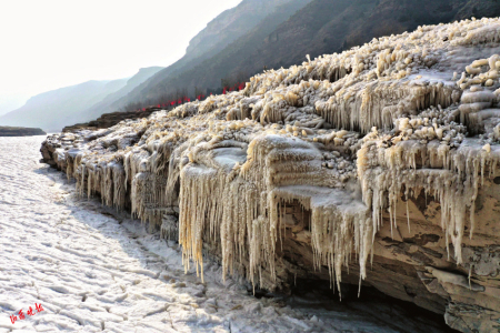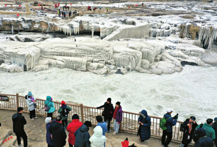 黃河壺口瀑布,往日奔騰咆哮的黃河水,像是被大自然施了魔法一般,飛濺的浪花和彌天水霧在兩岸巖石和護(hù)欄上迅速凝結(jié),形成了層層疊疊、形狀各異的冰掛。巨大的冰柱從河岸懸垂而下,宛如一座巨大的琉璃宮殿,又似一道天然的冰簾。河水拍打著冰層,發(fā)出震耳欲聾的咆哮聲,與飛瀑上空的彩虹交相輝映,展現(xiàn)出大自然的磅礴氣勢(shì)與壯美。