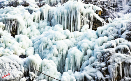 五老峰景區(qū)錦繡谷,工作人員借助天然溪流形成的冰掛加以人工造冰造型,按照生態(tài)環(huán)保和藝術(shù)創(chuàng)意要求,打造出長(zhǎng)約1公里、單體高3米至10米的彩色冰掛,極具視覺沖擊力。一條條冰掛或垂于崖壁,或懸于樹枝,晶瑩剔透,壯觀雄渾。滿目的玉樹瓊花、銀峰玉柱形成一幅霧凇冰掛奇景,讓人仿佛置身于童話世界。