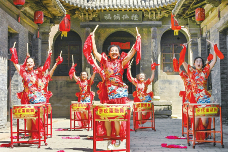 ②4月28日,太谷區(qū)文化館親疙蛋鼓舞隊(duì)隊(duì)員正在三多堂景區(qū)排練,為即將到來的“五一”假期展演做準(zhǔn)備。