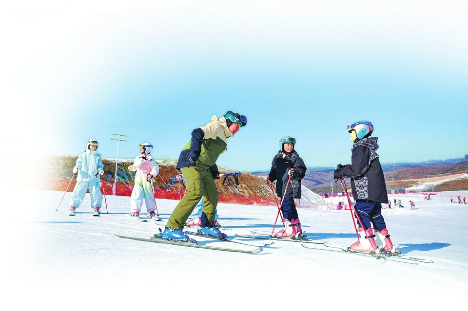 弗里茨·施特羅布(中)為小學(xué)生示范滑雪動(dòng)作。本欄圖片:吳艷斐攝