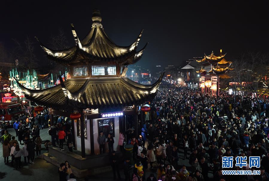2月22日晚,游人在夫子廟景區(qū)觀燈游玩。當(dāng)晚,在江蘇南京夫子廟秦淮風(fēng)光帶舉辦的秦淮燈會(huì)彩燈齊放,人們前來觀燈鬧元宵。 新華社記者孫參攝