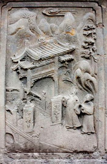 配坊實際上是一座功名石牌坊,上面刊載著武訪疇一家四代人的姓名及朝廷贈封的官爵,咸豐六年(1856)由武訪疇修建。這座石雕牌坊與其它牌坊最大的區(qū)別就是沒有題刻坊名,因此只能稱之為配坊。坐北向南,為四柱三間三樓單檐歇山頂結(jié)構(gòu),牌樓高8米,寬12米,坊體坐落在近1米高的長方形臺基上,立柱仍然采用夾柱石固定。坊頂覆蓋青瓦,正脊飾石雕貔貅裝飾,飛檐翹角,明樓檐下為“圣旨”牌,當(dāng)心間設(shè)兩層小字板,第一層題刻:“贈資政大夫曾祖父廷桂,贈夫人曾祖母李氏;誥贈資政大夫祖父秉壁,誥贈夫人祖母吳氏;誥贈資政大夫父烈,誥封夫人母朱氏。陜西分巡延榆綏兵備道、加四級武訪疇謹(jǐn)建?!钡诙宇}刻“大清咸豐六年歲次丙辰仲夏上院榖旦”。武訪疇借建坊要弘揚祖輩陰德,而祖輩的姓氏大名又不能題刻在母親的節(jié)孝牌坊上,所以,他必須另建一坊才能完整地表達心愿。實際上,這就是建造配坊的真正目的。也正因此在配坊題刻“龍光錫寵”、“鳳詔褒榮”、“克成先志”、“重裕后昆”等。