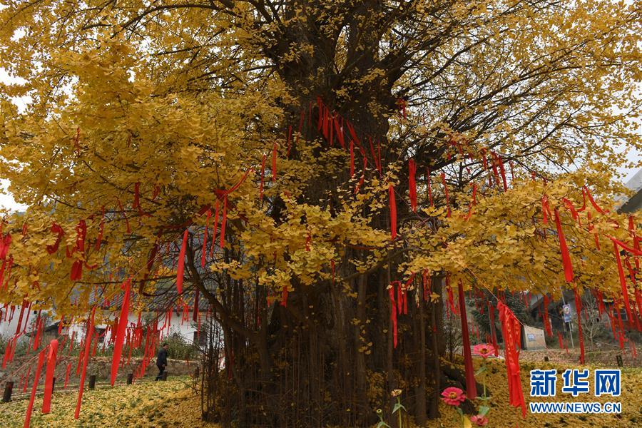 11月19日,游客在留壩縣玉皇廟鎮(zhèn)參觀千年銀杏樹(shù)。初冬時(shí)節(jié),在秦嶺深處的陜西省留壩縣玉皇廟鎮(zhèn)石窯壩村,一棵千年古銀杏樹(shù)的落葉宛如金色地毯,甚為壯觀。據(jù)當(dāng)?shù)亓謽I(yè)部門(mén)介紹,該樹(shù)胸徑為4.45米,現(xiàn)有高度29米。新華社記者 陶明 攝