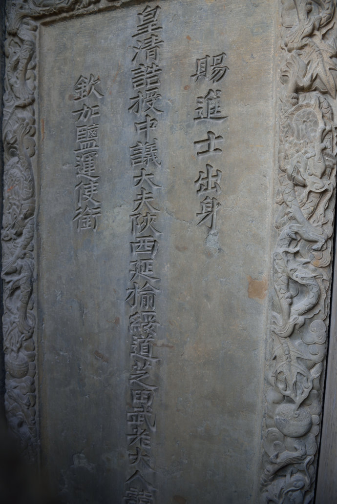 配坊實(shí)際上是一座功名石牌坊,上面刊載著武訪疇一家四代人的姓名及朝廷贈(zèng)封的官爵,咸豐六年(1856)由武訪疇修建。這座石雕牌坊與其它牌坊最大的區(qū)別就是沒有題刻坊名,因此只能稱之為配坊。坐北向南,為四柱三間三樓單檐歇山頂結(jié)構(gòu),牌樓高8米,寬12米,坊體坐落在近1米高的長(zhǎng)方形臺(tái)基上,立柱仍然采用夾柱石固定。坊頂覆蓋青瓦,正脊飾石雕貔貅裝飾,飛檐翹角,明樓檐下為“圣旨”牌,當(dāng)心間設(shè)兩層小字板,第一層題刻:“贈(zèng)資政大夫曾祖父廷桂,贈(zèng)夫人曾祖母李氏;誥贈(zèng)資政大夫祖父秉壁,誥贈(zèng)夫人祖母吳氏;誥贈(zèng)資政大夫父烈,誥封夫人母朱氏。陜西分巡延榆綏兵備道、加四級(jí)武訪疇謹(jǐn)建。”第二層題刻“大清咸豐六年歲次丙辰仲夏上院榖旦”。武訪疇借建坊要弘揚(yáng)祖輩陰德,而祖輩的姓氏大名又不能題刻在母親的節(jié)孝牌坊上,所以,他必須另建一坊才能完整地表達(dá)心愿。實(shí)際上,這就是建造配坊的真正目的。也正因此在配坊題刻“龍光錫寵”、“鳳詔褒榮”、“克成先志”、“重裕后昆”等。