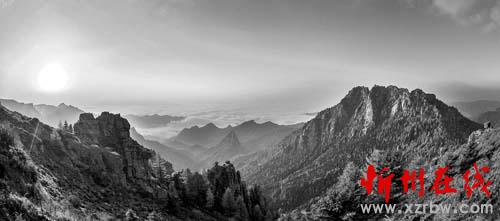 站在峰巔,舉目眺望,但見在初升的陽光照耀下,經(jīng)過大雨洗滌的綠色山峰,呈現(xiàn)出一種奇異的火紅色彩,別有一番神韻。環(huán)顧四周,峰巒重疊,溝壑縱橫,石猴山、臥虎山等30多座海拔2000多米以上的兄弟峰巒,簇?fù)碇盖偷奶J芽諸山,其勢綿延不絕,氣象磅礴壯觀。云霧在山峰飄蕩,如煙似雨,彌漫四合。尖峭高聳、怪石嶙峋的蘆芽諸山,突出于翻伏騰涌的云霧之上,仿佛蔥蘢茁壯的蘆芽破石而出,生機(jī)勃勃,鮮嫩欲滴,翠色宜人。