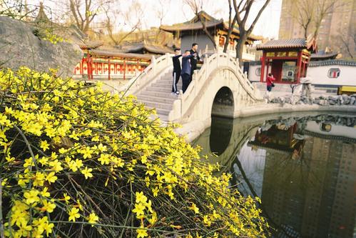 3月13日,玉蘭花、迎春花盛開(kāi)在太原碑林公園,鮮艷的花朵與古香古色的碑亭相映成趣,游人漫步在花香之中,擁抱春天。本報(bào)記者 孫榮祥攝