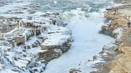 1月11日,人們?cè)诩h黃河壺口瀑布拍照游玩。連日來(lái),受冷空氣影響,吉縣黃河壺口瀑布形成壯美“冰瀑”景觀,吸引大量游客前來(lái)賞景。