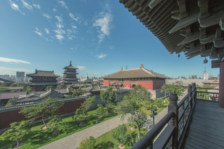 華嚴(yán)寺始建于遼重熙七年(公元1038年),其名取自佛教經(jīng)典《華嚴(yán)經(jīng)》中“慈悲之華,必結(jié)莊嚴(yán)之果”。寺院坐西向東,山門(mén)、普光明殿、大雄寶殿、薄伽教藏殿、華嚴(yán)寶塔等30余座單體建筑分別排列在南北兩條主軸線上,布局嚴(yán)謹(jǐn),規(guī)模宏大,占地面積達(dá)6.6萬(wàn)平方米,是我國(guó)現(xiàn)存年代較早、保存較完整的一座遼金寺廟建筑群,1961年被國(guó)務(wù)院公布為第一批全國(guó)重點(diǎn)文物保護(hù)單位,2014年被評(píng)為國(guó)家4A級(jí)旅游景區(qū)。