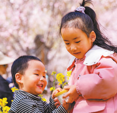 小朋友在桃樹(shù)下開(kāi)心玩耍。