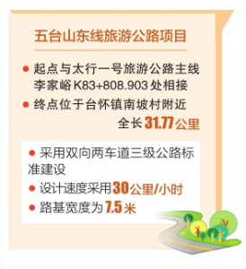 五臺(tái)山東線旅游公路起點(diǎn)與太行一號(hào)旅游公路主線李家峪K83+ 808.903處相接,終點(diǎn)位于臺(tái)懷鎮(zhèn)南坡村附近,全長(zhǎng)31.77公里,采用雙向兩車道三級(jí)公路標(biāo)準(zhǔn)建設(shè),設(shè)計(jì)速度采用30公里/小時(shí),路基寬度為7.5米。項(xiàng)目實(shí)施圍繞“扶貧、旅游、生態(tài)、人文、研學(xué)”等核心宗旨,著力提升五臺(tái)山風(fēng)景名勝區(qū)旅游公路的通行能力與服務(wù)水平,強(qiáng)化“交通+旅游”與“經(jīng)濟(jì)增長(zhǎng)”的導(dǎo)向作用。