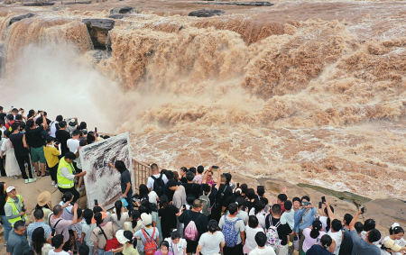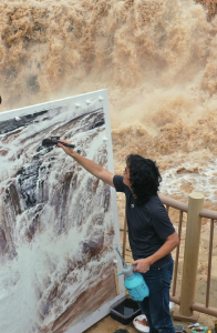 8月10日,一名畫家在吉縣黃河壺口瀑布景區(qū)現(xiàn)場(chǎng)創(chuàng)作(左圖)。連日來,吉縣黃河壺口瀑布水量持續(xù)增大,形成壯美瀑布群景觀,奔騰咆哮的雄姿吸引了眾多書畫愛好者前來創(chuàng)作。