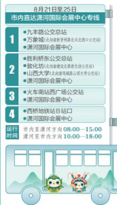 太原市將在山西文博會期間開通5條免費公交接駁專線。其中,4條市內(nèi)直達(dá)瀟河國際會展中心的專線,分別從九豐路公交總站—萬象城(北向南新晉祠路長興北街口公交站)—瀟河國際會展中心;勝利橋東公交總站—敦化坊(北向南建設(shè)北路敦化坊公交站)—山西大學(xué)(北向南塢城路山西大學(xué)公交站)—瀟河國際會展中心;火車南站西廣場公交站—瀟河國際會展中心;西橋地鐵站B站口—瀟河國際會展中心。運行時間為市內(nèi)至瀟河方向8:00—15:00,瀟河至市內(nèi)方向10:00—18:00。此外,為便于駕車自行前往的市民出行,還開通了1條社會停車場至山西瀟河國際會展中心的免費接駁線路。該線路從先行路瀟河大街口經(jīng)先行路至?xí)怪行耐颠\行,在智慧南街口、先行路樂商街口???,運行時間為9:00—18:00。