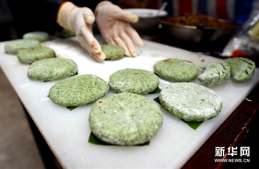 4月2日,黃山市徽州區(qū)西溪南村村民在制作清明粿。清明將至,安徽省黃山市徽州區(qū)的農家忙著制作清明粿。清明粿是當地清明時節(jié)的特色小吃,將新鮮艾草汁拌入糯米粉,再填入徽州特色風味的火腿肉、筍丁、肉絲蘿卜丁等原料做成的餡,捏合成清明粿,蒸熟即可食用。新華社發(fā)(周牧 攝)