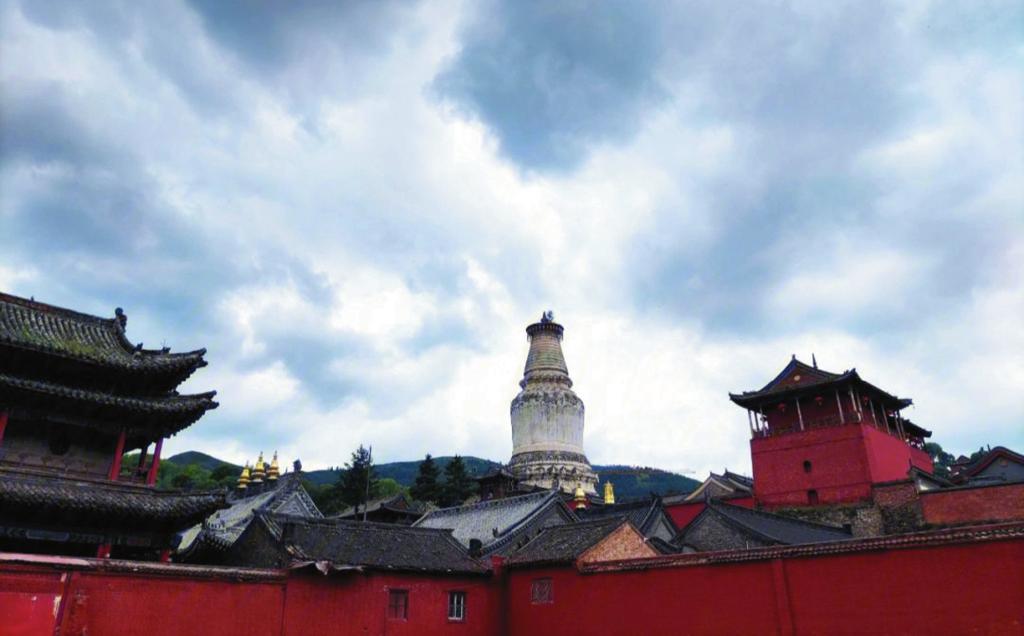 五臺(tái)山最具代表性的鈴聲就是從塔院寺高聳入云的大白塔上傳出的風(fēng)鈴聲。大白塔環(huán)周83.8米,通高75.3米,塔高56.4米,比北京北海白塔還高20.5米,比代縣阿育王塔高16.5米,是元大德五年(1301年)由尼泊爾匠師阿尼哥設(shè)計(jì)建造的尼泊爾式大塔,也是我國(guó)現(xiàn)存元代最高的覆缽式塔建筑。大白塔基座呈東、西、南、北、東南、東北、西南、西北八角形,塔身上面13層,呈由粗及細(xì)的輪狀造型,稱“十三天”,又名“十三相輪”?!笆臁鄙厦嫔w著8塊銅板,按乾、坎、艮、震、巽、離、坤、兌八卦位置安裝,周長(zhǎng)23.1米,檐邊吊裝銅質(zhì)垂檐36塊,共安裝風(fēng)鈴108個(gè),連同束腰風(fēng)鈴共252個(gè)。塔頂裝有高5.4米的鍍金寶瓶。整座白塔形如藻瓶,上下比例協(xié)調(diào),造型別致典雅。每當(dāng)風(fēng)吹鈴響,風(fēng)鐸鳴四端,悠然成風(fēng)韻,讓人油然而生崇敬之感。