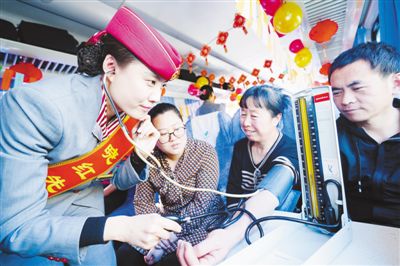 列車工作人員為旅客量血壓/人民日報(bào)記者賀勇攝