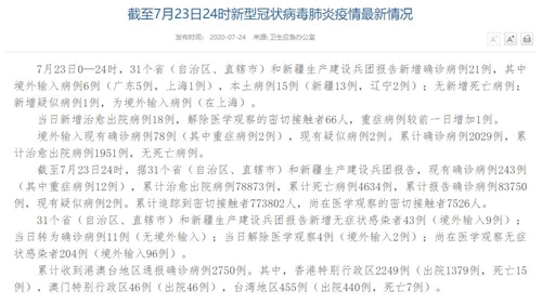 情況表示,截至7月23日24時,據(jù)31個省(自治區(qū)、直轄市)和新疆生產(chǎn)建設(shè)兵團(tuán)報告,現(xiàn)有確診病例243例(其中重癥病例12例),累計治愈出院病例78873例,累計死亡病例4634例,累計報告確診病例83750例,現(xiàn)有疑似病例2例。累計追蹤到密切接觸者773802人,尚在醫(yī)學(xué)觀察的密切接觸者7526人。