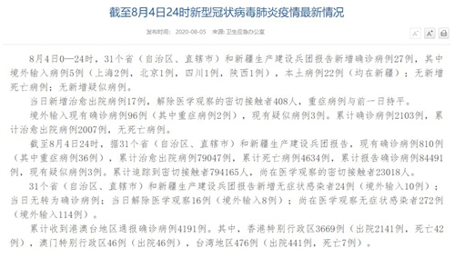 情況顯示,截至8月4日24時,據(jù)31個省(自治區(qū)、直轄市)和新疆生產(chǎn)建設(shè)兵團報告,現(xiàn)有確診病例810例(其中重癥病例36例),累計治愈出院病例79047例,累計死亡病例4634例,累計報告確診病例84491例,現(xiàn)有疑似病例3例。累計追蹤到密切接觸者794165人,尚在醫(yī)學(xué)觀察的密切接觸者23018人。