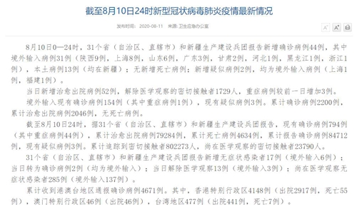 人民網(wǎng)北京8月11日電(董童)國(guó)家衛(wèi)生健康于今日在官網(wǎng)發(fā)布的《截至8月10日24時(shí)新型冠狀病毒肺炎疫情最新情況》(以下簡(jiǎn)稱“情況”)提出,8月10日0—24時(shí),31個(gè)?。ㄗ灾螀^(qū)、直轄市)和新疆生產(chǎn)建設(shè)兵團(tuán)報(bào)告新增確診病例44例,其中境外輸入病例31例(陜西9例,上海8例,山東6例,廣東3例,甘肅2例,河北1例,黑龍江1例,浙江1例),本土病例13例(均在新疆);無新增死亡病例;新增疑似病例2例,均為境外輸入病例(上海1例,福建1例)。當(dāng)日新增治愈出院病例52例,解除醫(yī)學(xué)觀察的密切接觸者1729人,重癥病例較前一日增加3例。