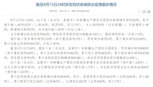人民網(wǎng)北京8月14日電(董童)國(guó)家衛(wèi)生健康委于今日在官網(wǎng)發(fā)布的《截至8月13日24時(shí)新型冠狀病毒肺炎疫情最新情況》(以下簡(jiǎn)稱“情況”)提出,8月13日0—24時(shí),31個(gè)省(自治區(qū)、直轄市)和新疆生產(chǎn)建設(shè)兵團(tuán)報(bào)告新增確診病例30例,其中境外輸入病例22例(上海16例,陜西5例,四川1例),本土病例8例(均在新疆);無(wú)新增死亡病例;新增疑似病例2例,均為境外輸入病例(均在上海)。當(dāng)日新增治愈出院病例64例,解除醫(yī)學(xué)觀察的密切接觸者1567人,重癥病例較前一日減少2例。