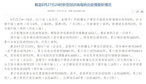 情況顯示,截至8月27日24時,據(jù)31個省(自治區(qū)、直轄市)和新疆生產(chǎn)建設兵團報告,現(xiàn)有確診病例288例(其中重癥病例4例),累計治愈出院病例80091例,累計死亡病例4634例,累計報告確診病例85013例,現(xiàn)有疑似病例3例。累計追蹤到密切接觸者814039人,尚在醫(yī)學觀察的密切接觸者10040人。
