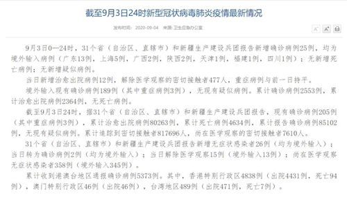 情況顯示,截至9月3日24時(shí),據(jù)31個(gè)?。ㄗ灾螀^(qū)、直轄市)和新疆生產(chǎn)建設(shè)兵團(tuán)報(bào)告,現(xiàn)有確診病例205例(其中重癥病例3例),累計(jì)治愈出院病例80263例,累計(jì)死亡病例4634例,累計(jì)報(bào)告確診病例85102例,無現(xiàn)有疑似病例。累計(jì)追蹤到密切接觸者817696人,尚在醫(yī)學(xué)觀察的密切接觸者7610人。