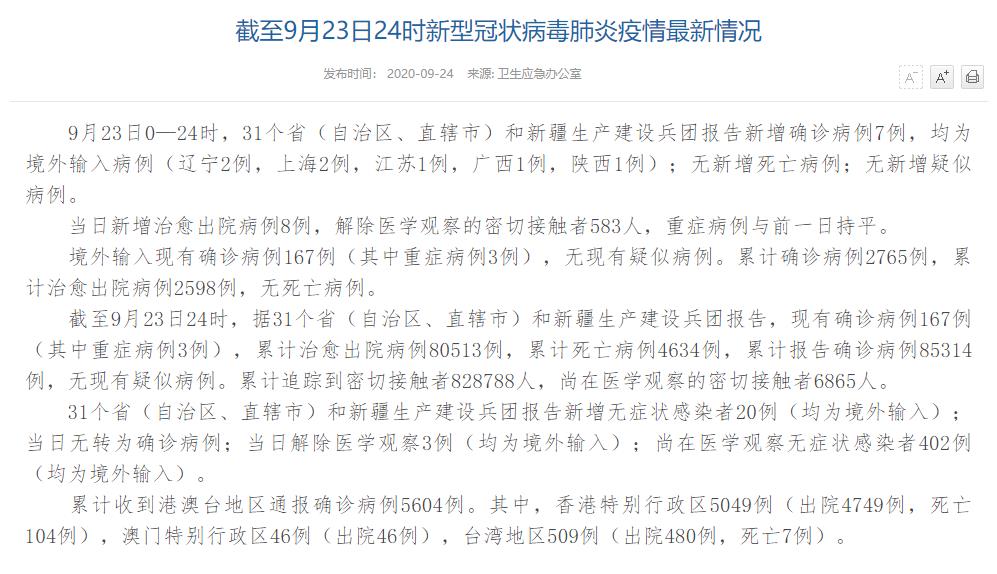 人民網北京9月24日電(董童)國家衛(wèi)生健康委于今日在官網發(fā)布的《截至9月23日24時新型冠狀病毒肺炎疫情最新情況》(以下簡稱“情況”)提出,9月23日0—24時,31個?。ㄗ灾螀^(qū)、直轄市)和新疆生產建設兵團報告新增確診病例7例,均為境外輸入病例(遼寧2例,上海2例,江蘇1例,廣西1例,陜西1例);無新增死亡病例;無新增疑似病例。當日新增治愈出院病例8例,解除醫(yī)學觀察的密切接觸者583人,重癥病例與前一日持平。
