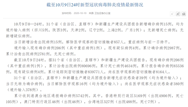 人民網(wǎng)北京10月10日電(許曉華)國家衛(wèi)生健康委于今日在官網(wǎng)發(fā)布的《截至10月9日24時(shí)新型冠狀病毒肺炎疫情最新情況》(以下簡稱“情況”)提出,10月9日0—24時(shí),31個(gè)省(自治區(qū)、直轄市)和新疆生產(chǎn)建設(shè)兵團(tuán)報(bào)告新增確診病例15例,均為境外輸入病例(四川5例,陜西3例,天津2例,遼寧2例,上海2例,廣東1例);無新增死亡病例;無新增疑似病例。當(dāng)日新增治愈出院病例15例,解除醫(yī)學(xué)觀察的密切接觸者857人,重癥病例與前一日持平。
