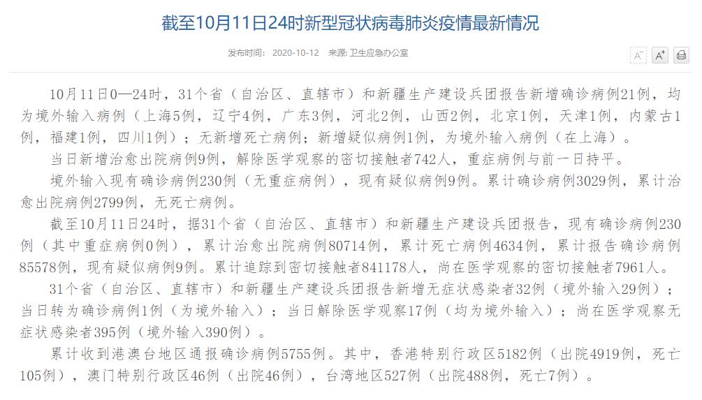 人民網(wǎng)北京10月12日電(董童)國(guó)家衛(wèi)生健康委于今日在官網(wǎng)發(fā)布的《截至10月11日24時(shí)新型冠狀病毒肺炎疫情最新情況》(以下簡(jiǎn)稱(chēng)“情況”)提出,10月11日0—24時(shí),31個(gè)?。ㄗ灾螀^(qū)、直轄市)和新疆生產(chǎn)建設(shè)兵團(tuán)報(bào)告新增確診病例21例,均為境外輸入病例(上海5例,遼寧4例,廣東3例,河北2例,山西2例,北京1例,天津1例,內(nèi)蒙古1例,福建1例,四川1例);無(wú)新增死亡病例;新增疑似病例1例,為境外輸入病例(在上海)。當(dāng)日新增治愈出院病例9例,解除醫(yī)學(xué)觀察的密切接觸者742人,重癥病例與前一日持平。