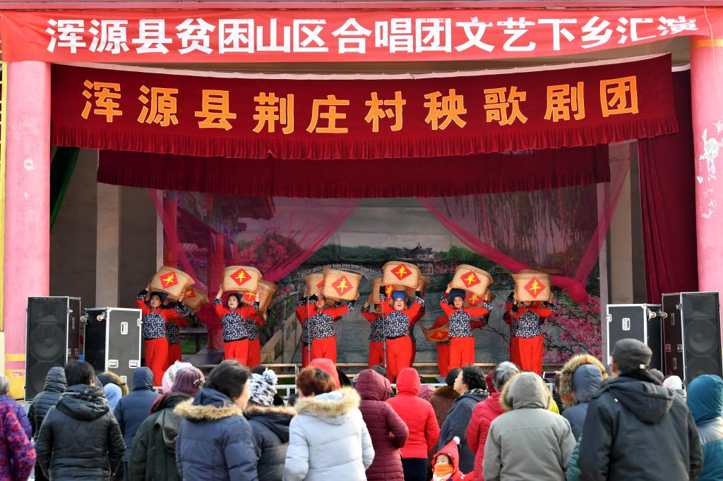 ↑1月3日,在山西省渾源縣荊莊村,渾源縣貧困山區(qū)合唱團(tuán)在表演歌舞《看山看水看中國(guó)》。