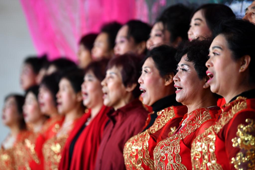 ↑1月3日,在山西省渾源縣荊莊村,渾源縣貧困山區(qū)合唱團(tuán)在表演合唱《紅梅贊》。