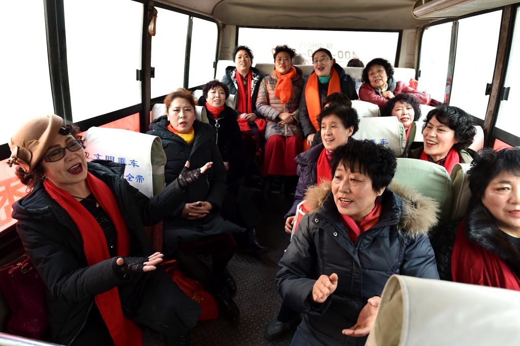 ↑1月3日,渾源縣貧困山區(qū)合唱團(tuán)團(tuán)員們?cè)谇巴G莊村的大巴車上排練。