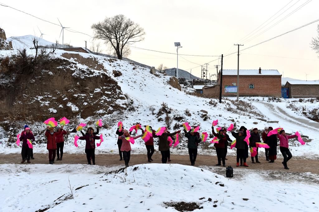 ↑1月2日,在山西省渾源縣山陰山村,村民在練習(xí)渾源縣貧困山區(qū)合唱團(tuán)新教的秧歌。
