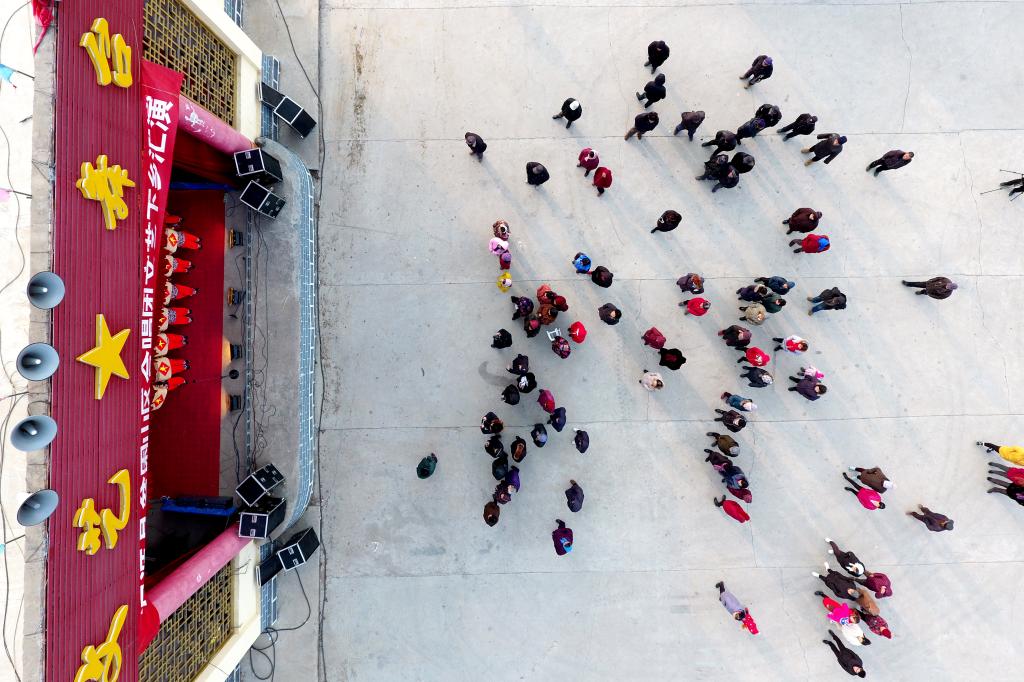 ↑1月3日,在山西省渾源縣荊莊村,村民們?cè)谛蕾p渾源縣貧困山區(qū)合唱團(tuán)的演出(無(wú)人機(jī)拍攝)。