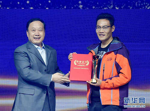 1月18日,“環(huán)保衛(wèi)士”次仁旦達(右)上臺領(lǐng)獎。 當(dāng)日,新華社主辦的“中國網(wǎng)事·感動2018”年度頒獎典禮在中國傳媒大學(xué)舉行,10位“草根”成為舞臺上最閃亮的明星。新華社記者 李賀 攝