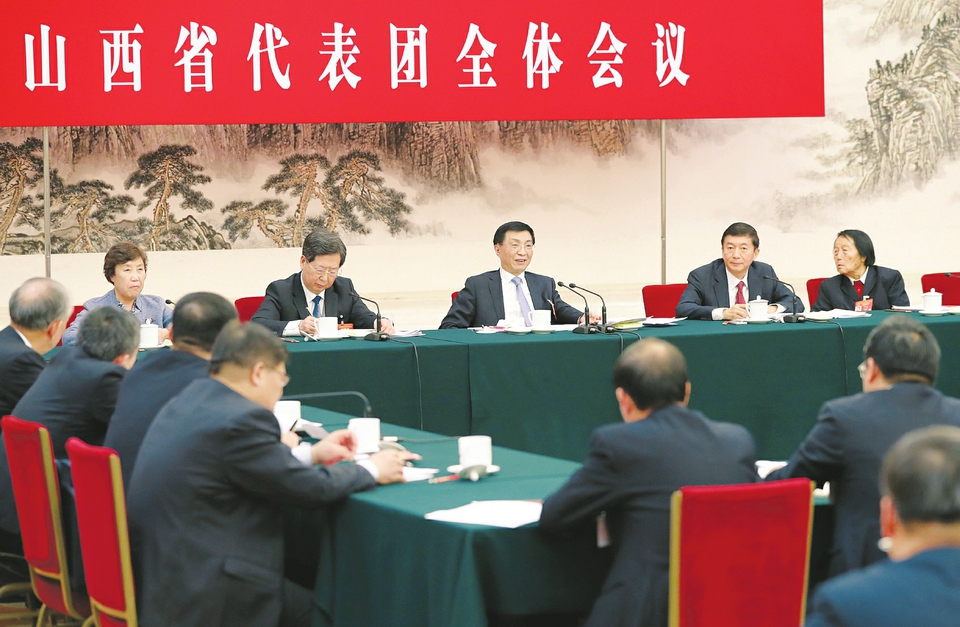 3月12日,中共中央政治局常委、中央書記處書記王滬寧參加十三屆全國人大二次會議山西代表團的審議。新華社記者丁海濤攝