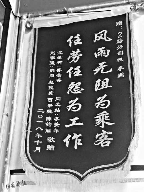 撿到東西歸還失主,失主送來(lái)表?yè)P(yáng)信比較常見(jiàn),山西晚報(bào)記者發(fā)現(xiàn)有一張比較例外。一位署名“2路乘客”的感謝信中這樣寫(xiě)道:“2017年以前,可以說(shuō)偶爾坐2路,因?yàn)榻?jīng)常會(huì)有等不上車(chē)的情況。但自從李鵬接上2路以后,基本上沒(méi)出現(xiàn)過(guò)等不上車(chē)的情況……作為長(zhǎng)期乘坐公交的乘客真心非常感謝……”錦旗是7名乘客集體送的,“風(fēng)雨無(wú)阻為乘客,任勞任怨為工作”,14個(gè)字,表達(dá)的是乘客對(duì)李鵬的認(rèn)可。